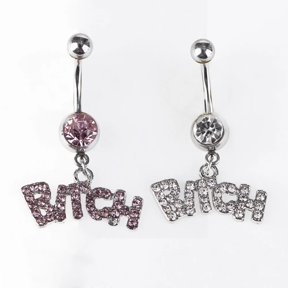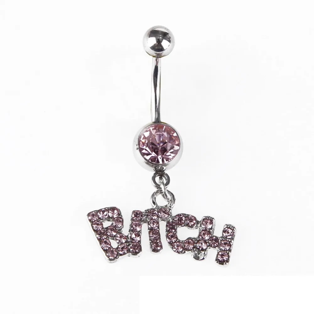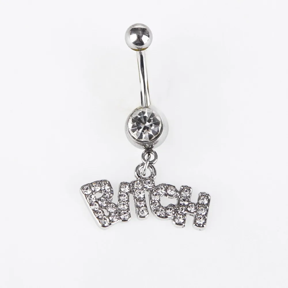 Discount 1 PC Full Rhinestone BITCH Letters Navel Piercing Ring Sexy Barbell Medical Steel Belly Button Nail